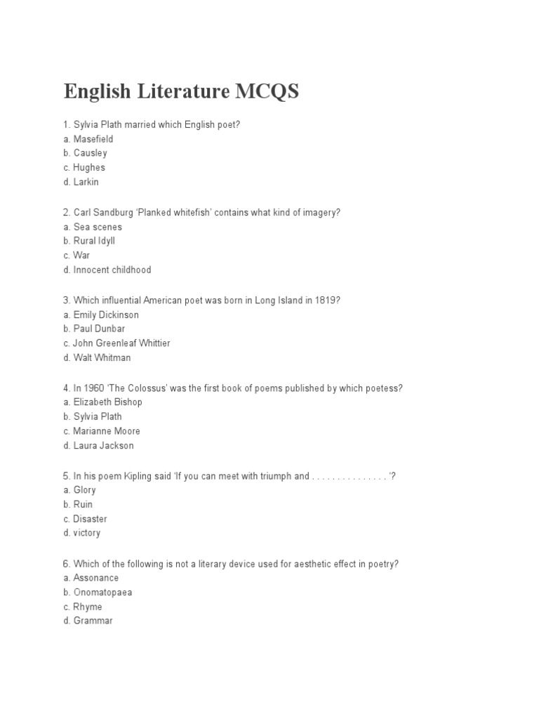 English Literature Multiple Choice Questions On American Literature Teachmatters